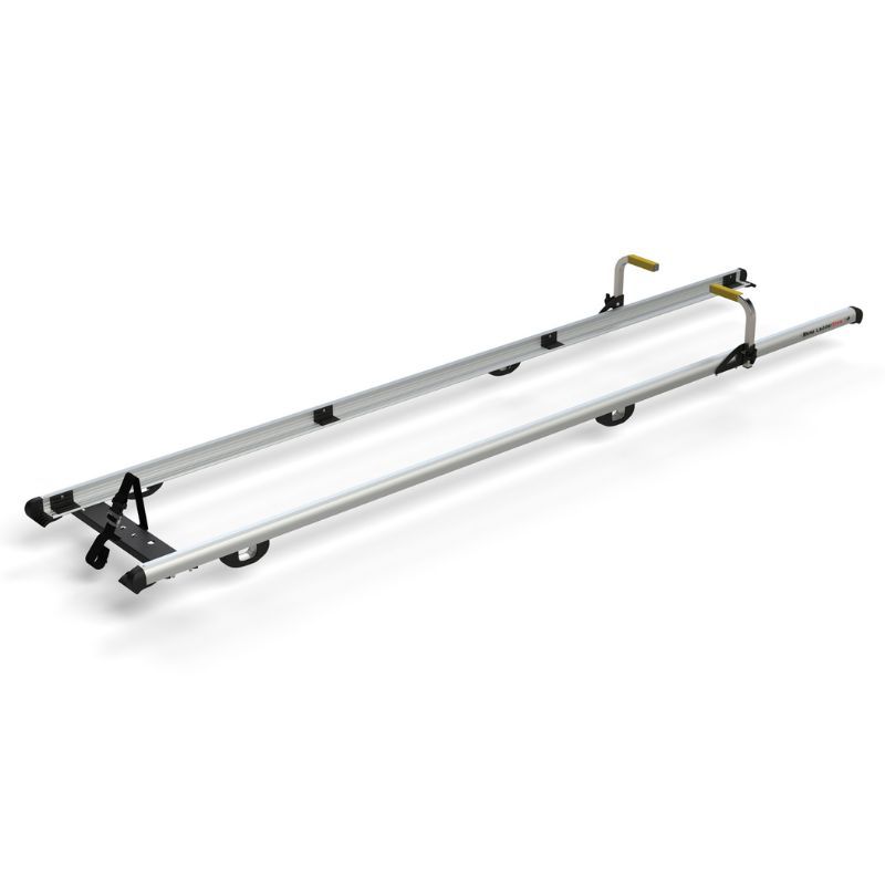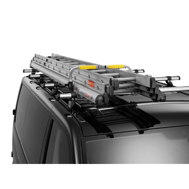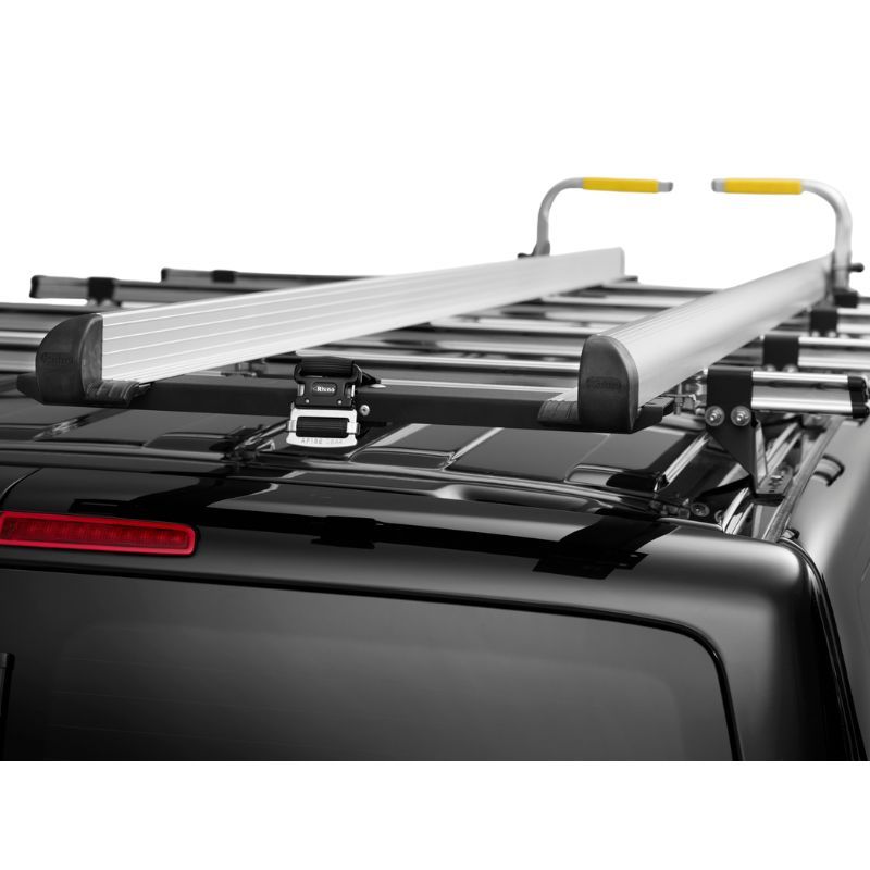 Porte-échelles sur barres de toit pour toits bas, ergonomique et sécurisé, guidages réglables, jusqu’à 3 sections emboîtables, installation par une seule personne.